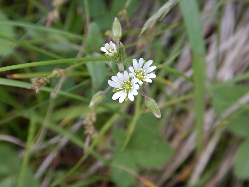 ヤマハコベ 山地の木陰や林の縁などに生える多年草です。葉は柄がなく、 茎も葉もともに星状毛を密生するのが特徴です。 ヤマハコベの名は、山に生えるハコベの意味で名づけられたと いいます。 ヤマハコベの花弁のない品種はアオハコベといいます。