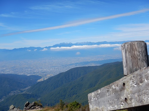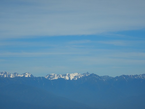 朝の北アルプス槍ヶ岳(思い出の丘駐車場より) 2週間前の台風で日程を今日にしたという秋田からお越しのお客さんは、 霧がとれて北アルプスが見えたことに感動していました。