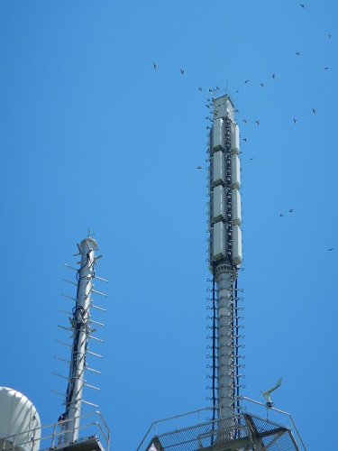 イワツバメ群 全長14.5cm。ツバメの仲間ですが、小柄です。 日本では夏鳥として渡来し、全国で繁殖していますが、九州で は越冬するものもいます。 本来自然の崖地に巣をつくっていたのでイワツバメですが、最近 ではコンクリツバメと呼んでもいいかと思うほど、人工構造物で 見ることが多くなりました。