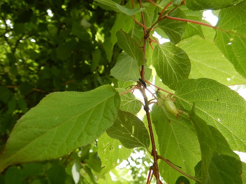 マタタビ(実) 未熟な果実(緑)は辛いですが、黄褐色に熟すと甘味が出ます。 (完熟すると柿のようにトロッとしています。) タタビという名前の由来は、旅人がこの果実を食べると元気に なって、また旅に出たくなるためという俗説が有名ですが、こ れには否定的な見解が多く、アイヌ語のマタタンブ(冬に樹に ぶら下がっている土産の意味)によるとする説が根強いです。