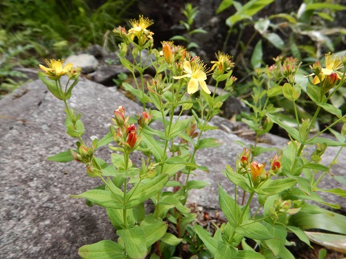 アカテンオトギリ 美ヶ原・鉢伏山・霧ヶ峰に分布しています。1928年、百瀬静男 氏が長野県の鉢伏山で最初に発見しました。 山地~高山の草地や岩場などに生える高さ15~30cmの多年草で す。茎は上部で分枝、下部は紅色を帯びます。葉は卵形で黄緑色、 赤い腺点が多いです。葉の裏面にも赤い腺点があります。 花は朝開き、午後には閉じてしまうため、撮影は晴天の午前中に 限られます。