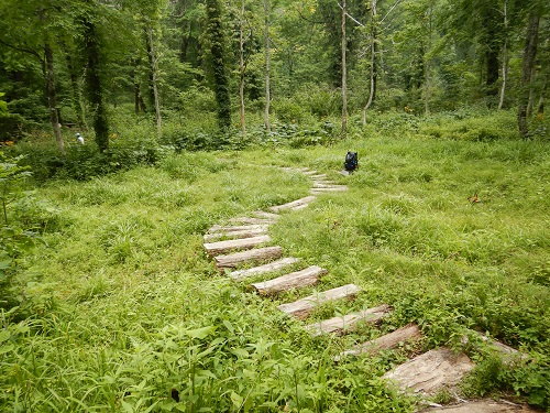 天生の遊歩道は雨水が流れて壊れないよう工夫がされています。 遊歩道に施されている3本の木は、階段と水切りの役割を兼ねています。 次の写真で写真左手側をアップします。