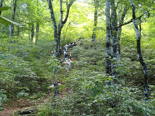 木平湿原までの荷上げ、距離にして2.8kmです。 残暑厳しい中、道中には急登もあり、ハードな作業となりました。 急登を登り終えて、笑顔で一息です。 土木協会の皆さんに上げて頂いた木道は、本年試験的に湿原に設置します。 ご協力頂いた皆さん、ありがとうございました。