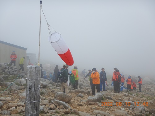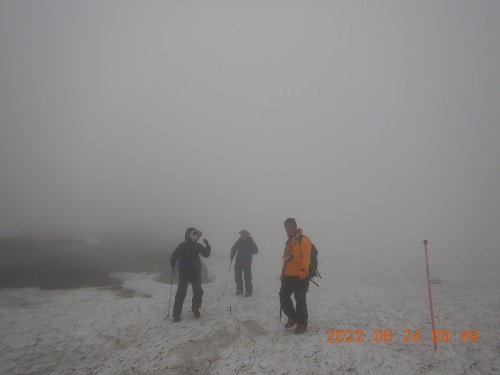 ガスの中、八丁坂でグリーンロープを補修しながらパトロール。
