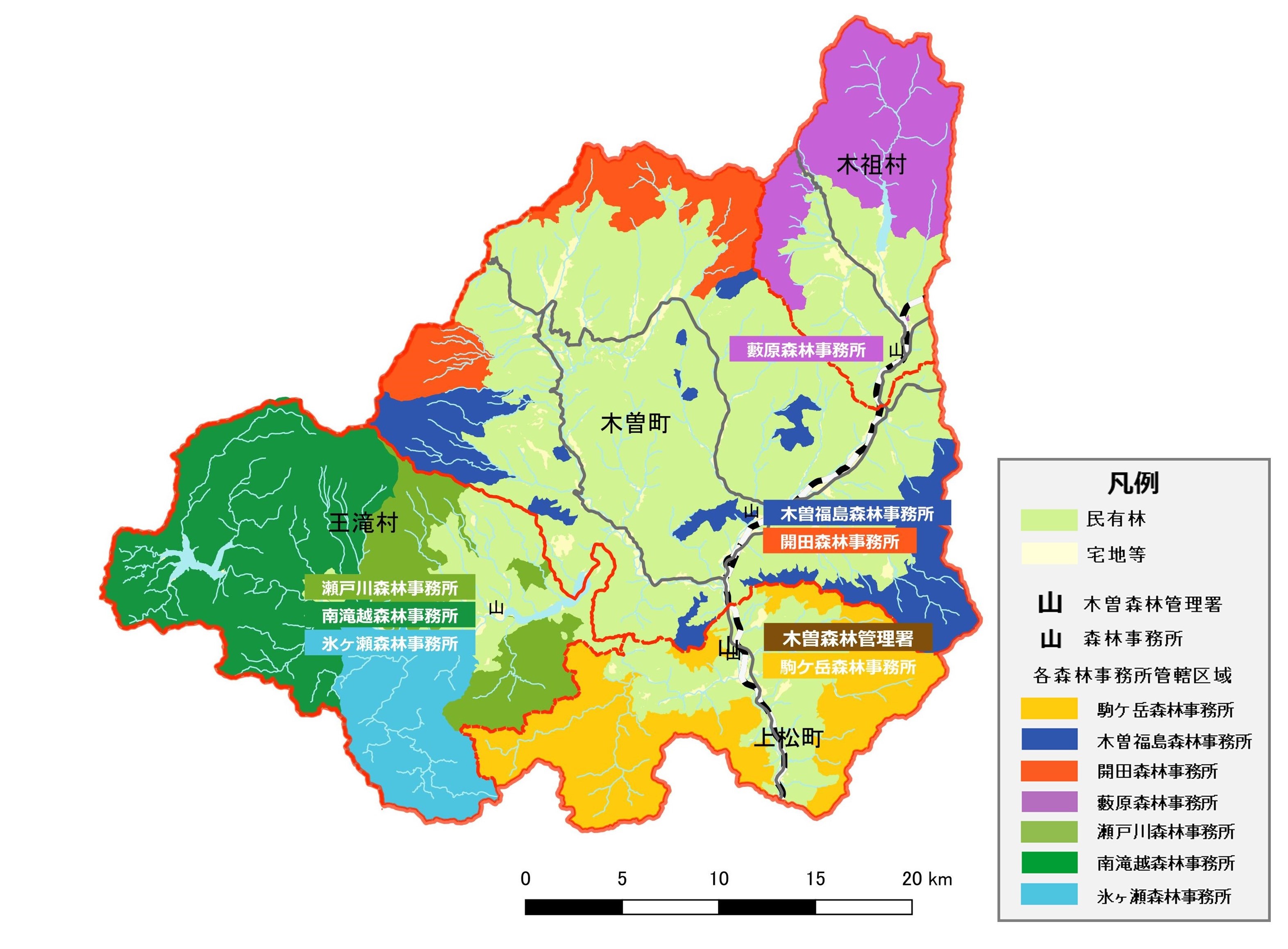木曽郡内の木曽町、上松町、木祖村、王滝村の2町2村の国有林野を7つの森林事務所が管理しています。