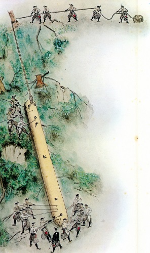 大正九年、裏木曽からの神宮(伊勢)用材を大材吊りで出材する様子