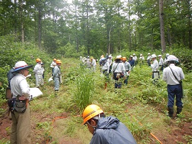 民有林・国有林の森林・林業の関係者の方々に、この試験地の現地視察を通じて、森づくりの参考として頂くことと、さらには研究機関の方々との天然更新に関する情報交換を目的に検討会を開催しました。