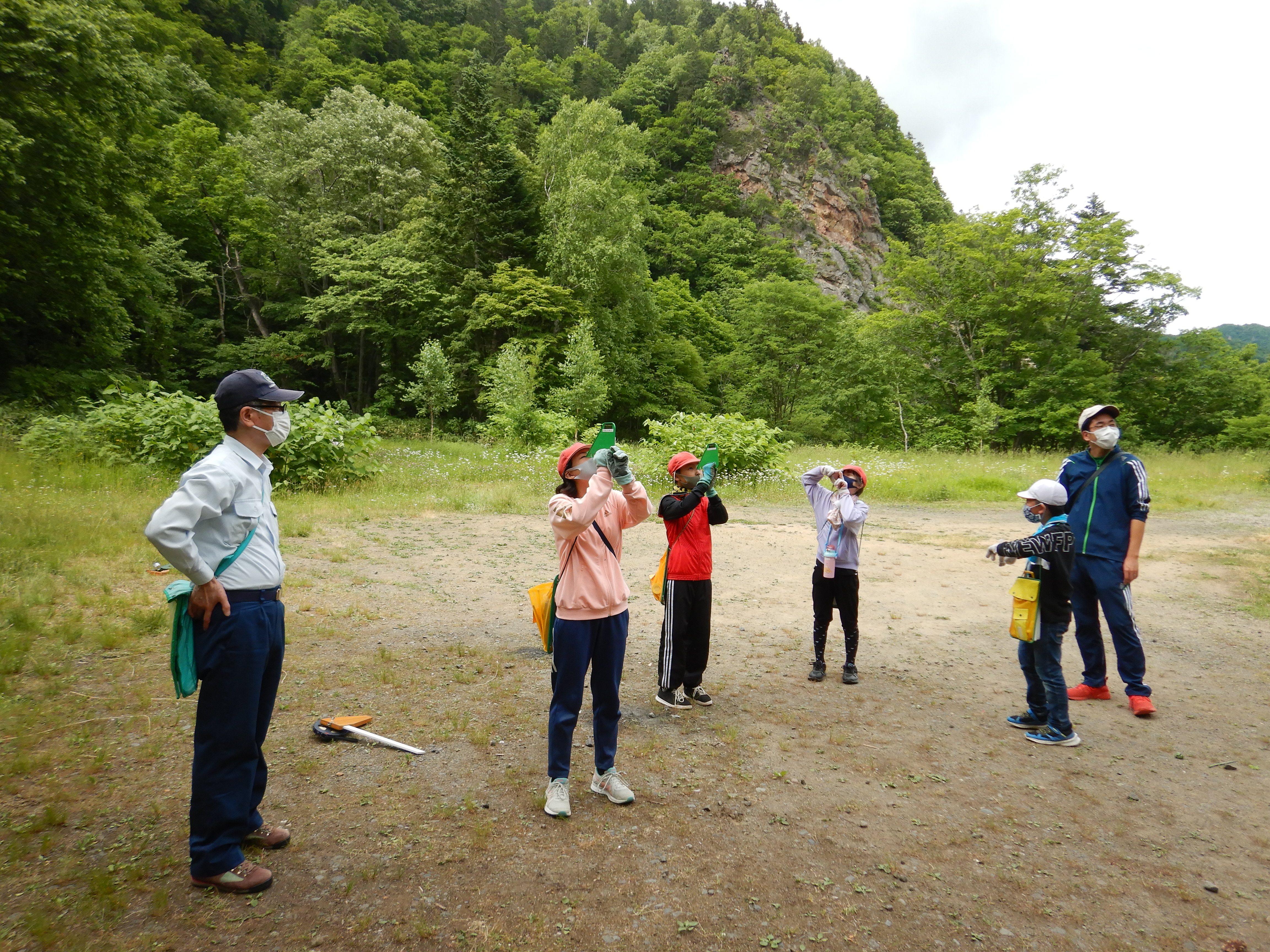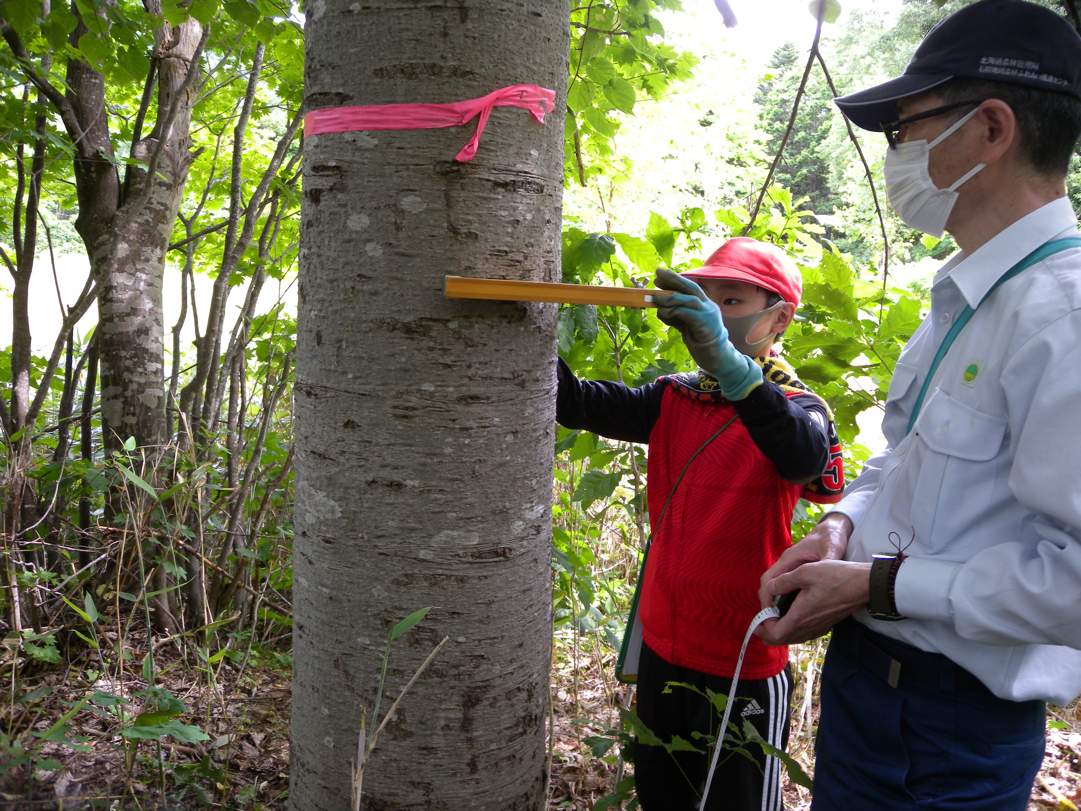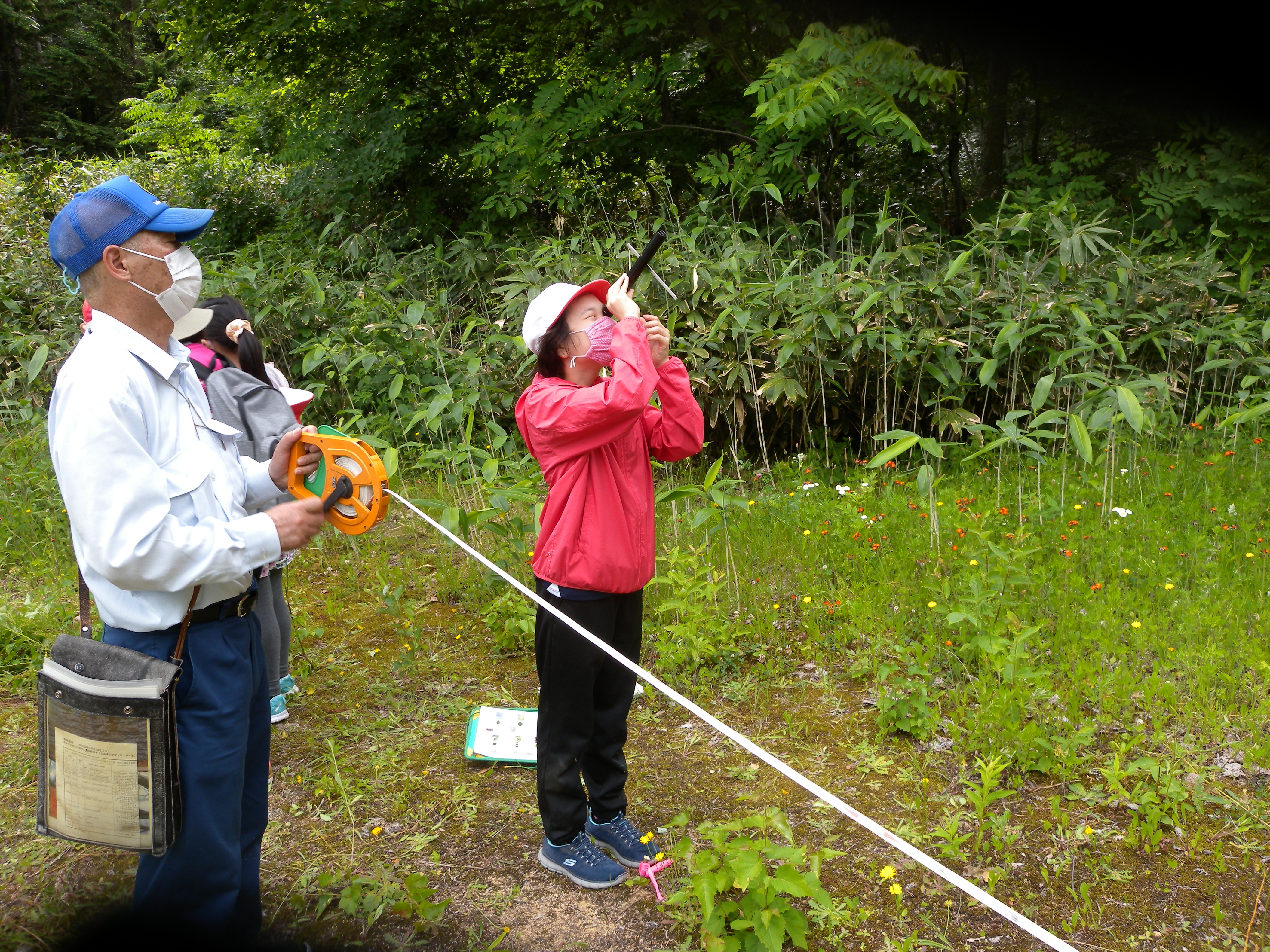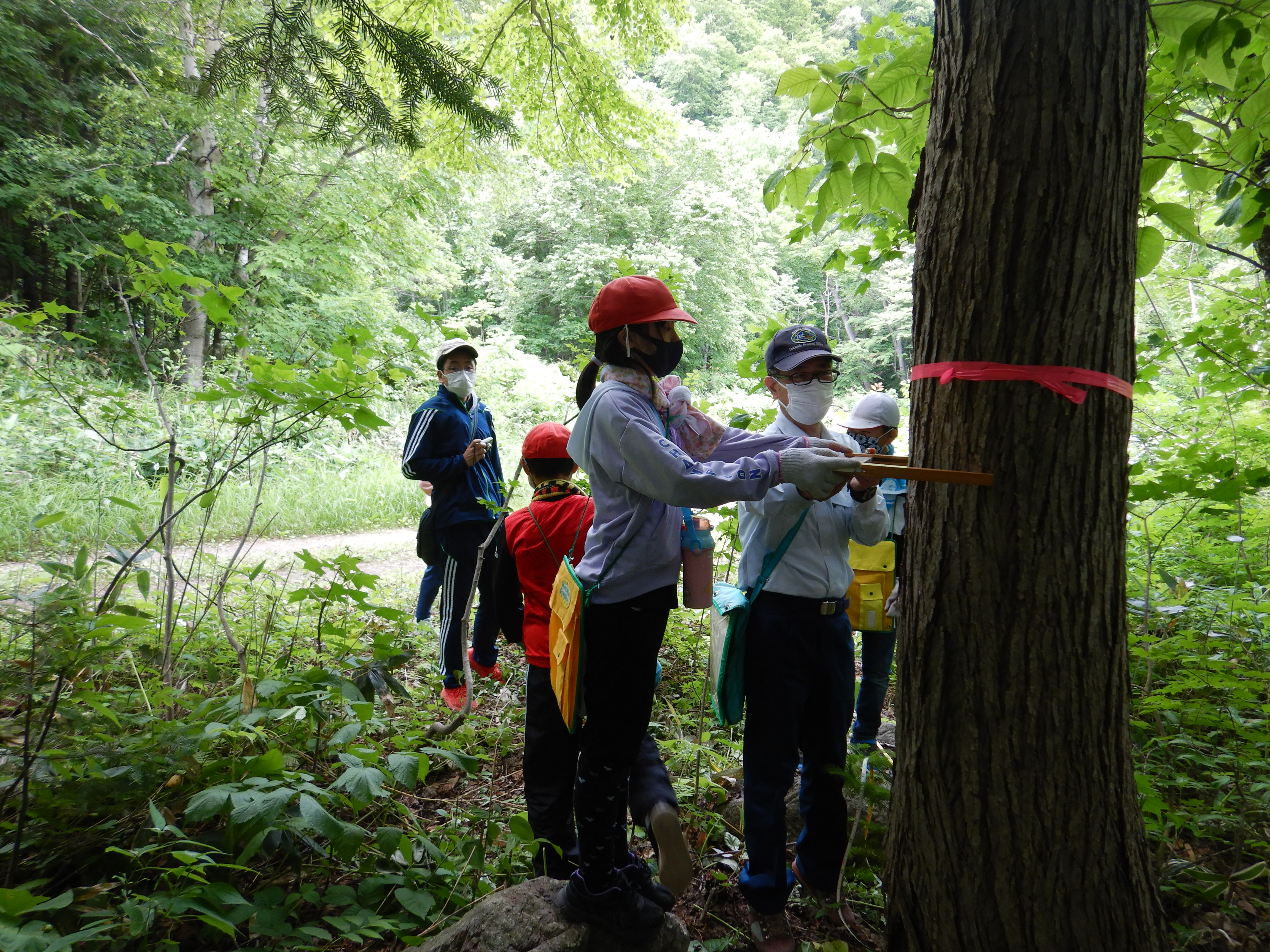 第2回森林教室は定山渓小学校5年生・6年生の生徒を対象に6月29日(火曜日)、定山渓国有林2001林班において実施しました。身近にある木製品の材料となっている樹木について、定山渓の森林にある樹木で、太さや大きさを実際に測って体感してもらいながら関心を持ってもらうということで、今回は測高器(タンジェントハイトゲージ、K式測高器)を使った樹高測定と輪尺を使って樹の太さを計りました。