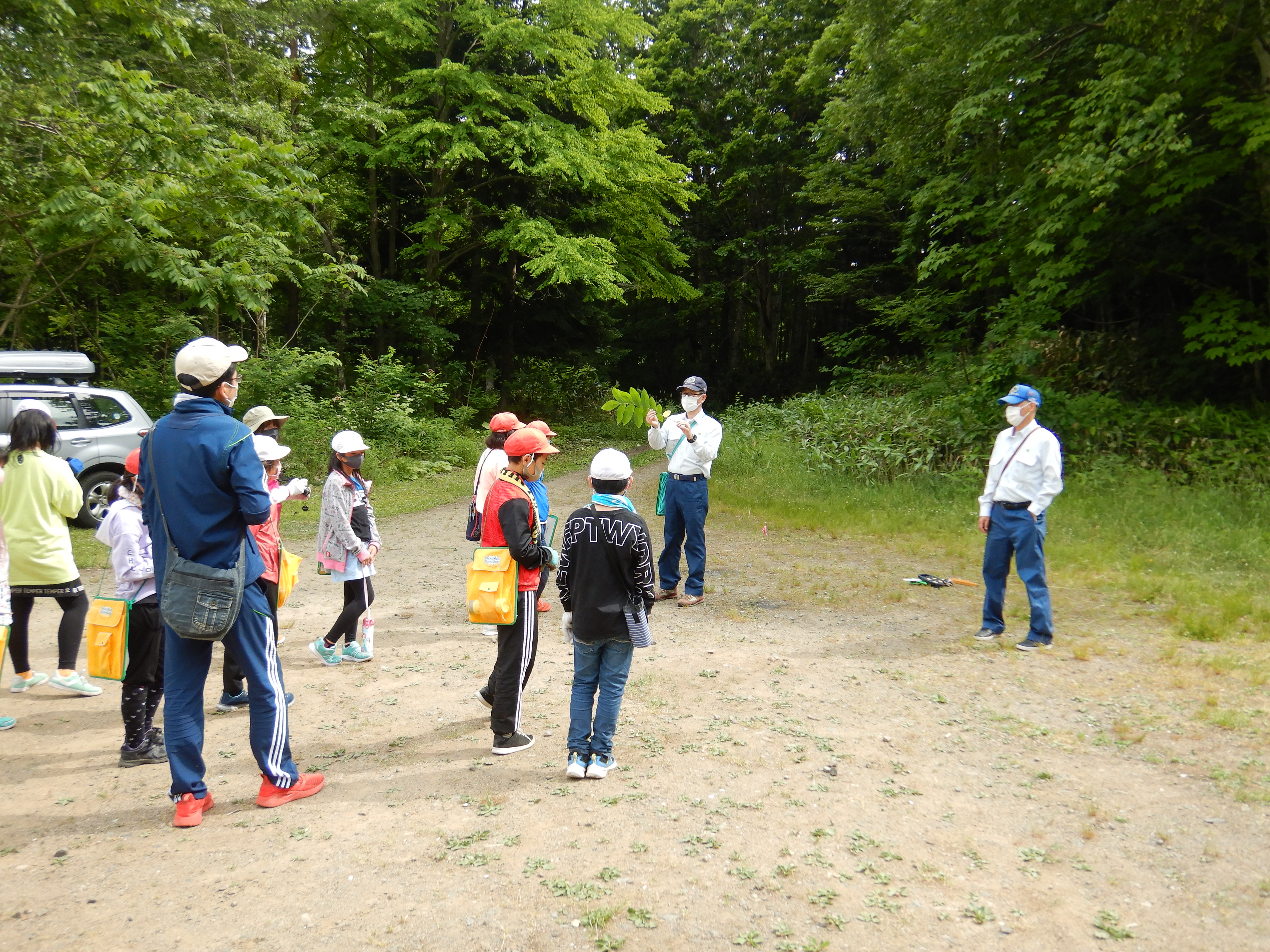 調査が思っていた以上に時間がかかったため、森林散策は少しの時間しか取れませんでしたが、職員からの広葉樹の葉の付き方の違いなどの説明を真剣に聞いていました。