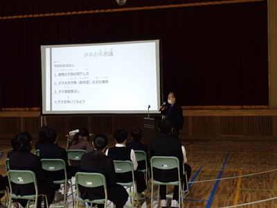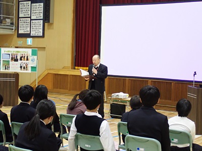 札幌市立義務教育学校定山渓学園の5~9年生(小学5~中学3年)が1年間を通して取り組んでいる環境学習、森林保全、自然とのふれあい・観察等の活動結果を紹介する「令和7年度森づくり活動発表会」を12月18日(木曜日)に定山渓学園で開催しました。開会にあたり主催者代表の挨拶として北海道森林管理局武田森林整備部長から「定山渓の森林は、札幌市に良質な水を育んでいる水源の森を活動地として、平成22年から森林の大切さ、動植物と森林の関係などについて観察や調査、森林づくり活動など定山渓学園の取組として定着させてほしい。」と挨拶がありました。