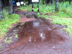 雌阿寒温泉側の入林届ポスト前です。この場所は上からの水が流れ込み、雨が続くといつも大きな水たまりができます。歩行に支障があるため、水切りをしました。