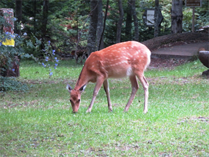 いつも野営場にいる雄のエゾシカではなく、今日は雌のエゾシカがこちらを気にしながら草を食んでいました。
