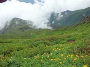 チシマノキンバイソウの群生。黒岳山頂直下で咲いています。