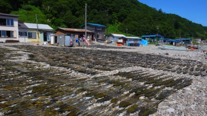 天候が回復して海岸線のコンブ干場にはコンブが整然と並べられています。