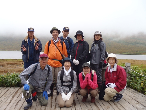 集合写真のとおり雲がだいぶ低い所まできています。どうやら雨は降らなさそうですが登山でのケガは気がゆるんだ帰り道に多いと言います。万が一の時のために緊急時に対応するためスタップ等も待機しており万全を期しておりますが、参加者の皆さんで気を引き締めて戻りましょう。