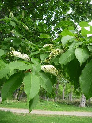 シウリザクラのズームアップです。白くて小さなお花がたくさん集まって一つの房になっています。 知床ではシウリザクラが今一番、見頃をむかえています。