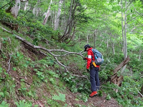 登山道には今年の冬の嵐で倒れたと思われる倒木が多数有り、除去しながらの巡視です。