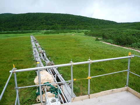 仮設の展望台から見た旧木道(写真中央)と、付け替えられた新しい木道(写真右側)の様子です。 今後、旧木道は撤去されて立ち入り禁止となります。