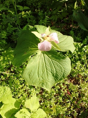 周辺のオオバナノエンレイソウは真っ白な花を咲かせていましたが、 ひとつだけ桃色に色づいていました。