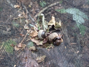 今年の第一回目のドングリの数は例年に比べとても少なく、シードトラップを設置した27本のミズナラの内、ドングリが落ちていたのは13本で、ドングリの総数は49個でした。