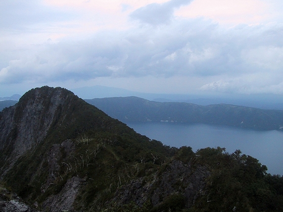 登山道のお馴染み三角摩周湖、またはブルーカクテル。天気があまり良くなかったので青さはいまひとつでした。