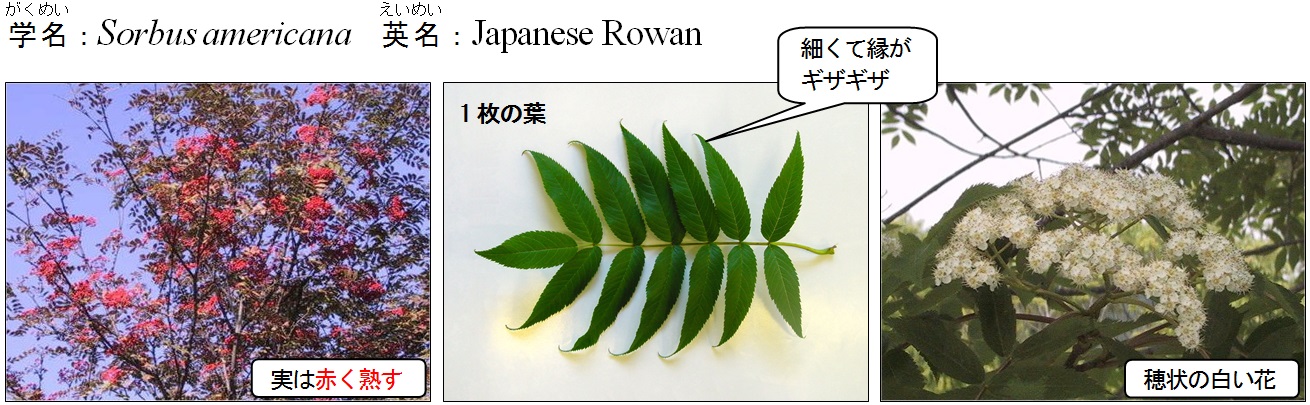 ・ 葉:奇数羽状複葉、小葉は長だ円状披針形で先が細く尖る 小葉は9~15枚、基部は円形、ふちは鋭重鋸歯、互生 ・ 幹:皮は灰黒褐色、横に浅く裂ける皮目 ・ 花:穂状につく白い花、緑色の果実が赤くなる ・ 冬芽:互生、長だ円形で先端は尖る、3~4枚の芽鱗 頂芽は側芽よりやや大きく赤紫色 ・ 花言葉「安全・慎重・用心」=交通安全の願いから街路樹に多い |
