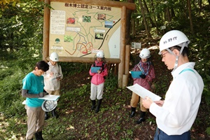 事前学習では、参加者の一人は、樹木の葉がどれも一緒に見えてと言っていましたが、学習をとおして、木の肌が青いからアオダモ・木の幹の皮を剥いだら黄色だからキハダ・クリの葉にトゲがある説明に「へーェ、本当だ」を連発しながらも真剣にメモをとっていました。