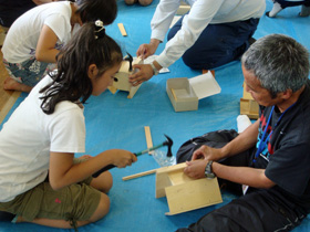 身の回りにある自然にふれることを目的に、日吉が丘児童館で昨年に引き続き開催し、今回で2回目になります。当日は夏休み中で、25名の小学生が集まり、樹木博士認定会、自然の材料を利用したクラフト作り、巣箱作りに挑戦しました。