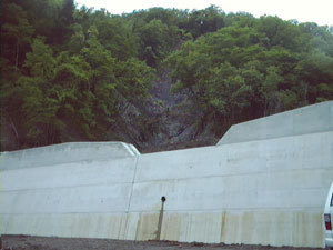 災害関連事業で設置された平成16年完成の渓間工(上記箇所のアップ)と後背の崩壊地の様子です。