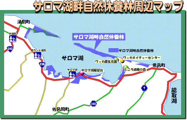 サロマ湖畔自然休養林は、オホーツク海沿岸の砂丘状の半島を境にして東西に約25キロメートル、南北には内陸部に向かって約2~9キロメートルの椀形をしたサロマ湖の周辺にあり、サロマ湖と一体化した森林で形成されています。