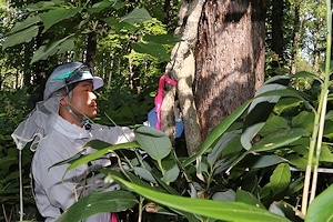 林に入り、この森林に何本くらいの木があるか、どのくらいの量の木材が生産できるかを調査します。