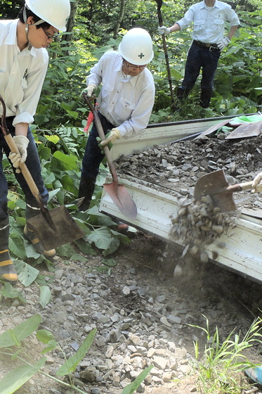 現地実習は、小樽市の塩谷国有林で行うことになっており、現地へは土場沢林道をバスで移動します。 砂利道のため、路面が雨水などで傷んだ場所があり、バスの走行に支障がないように軽トラックで砂利を運びながらスコップで敷き詰めて補修しました。