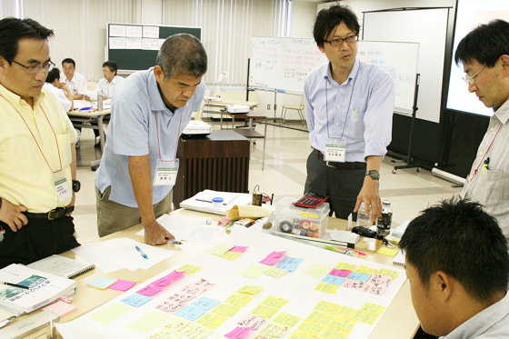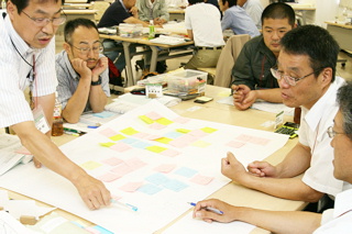 講師からのアドバイスを受けながら、KJ法で考えをまとめて行きます。