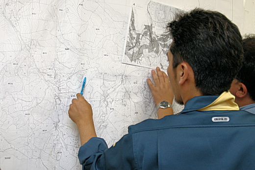 昨日の机上演習で作成した林業専用道の配置図を手に、幹線となる林道からの取り付け部分となる箇所、そしてそこから先の地形、地質などを一つ一つ確認し、林業専用道のルートと作設の可否などについて検討を行いました。