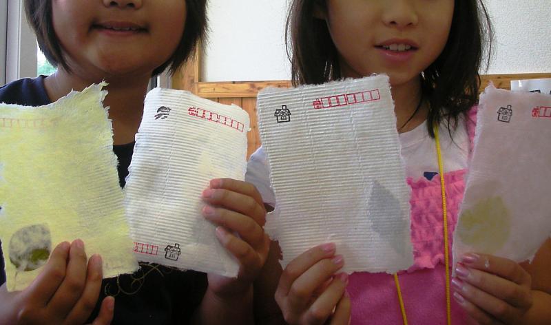 完成!! 今回はミズナラやカエデ、カツラなどの緑の葉をすき込んだり、キハダで色をつけたりしました。 個性豊かなポストカードのできあがり。