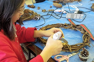 ツルに松ボックリなどの飾りをホットボンドで取り付けていきます。 |