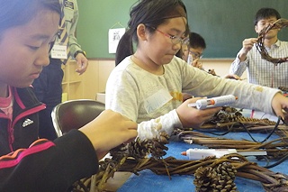 さて次は、森から集めてきたツルや木の実を使ったクリスマスリースを作ります。