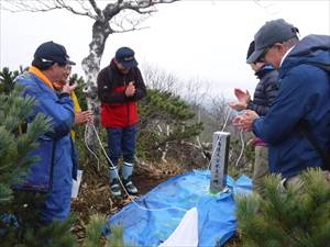 除幕式当日には、25名が参集し、約2時間をかけ三国山山頂へ到着、開会式では、北海道森林管理局長、北見市、上川町、上士幌町、国土地理院、野尻氏に挨拶をいただき、参加者全員による記念撮影、石碑に移動し、除幕式、石碑への水やり(3つの海へたどり着くことを祈念)を行い、当初予定の行事を無事終了することができました。