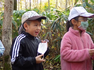 10月25日(月曜日)、苫前町立古丹別小学校1年生の皆さん4人と、「森林とふれあう中から五感を使い森林の空間を感じてもらう」ことを目的に、苫前町三渓地域の苫前ダムに隣接する国有林「サンケベツ遊々の森」(平成19年に苫前町教育委員会と協定を締結)を散策しながら、「葉の形・色・種子の形などを見て、触って、観察してみよう!」というテーマのもと、森林内の樹木や動植物について学びました。まず、当署の本間首席森林官より挨拶と自己紹介、森林散策を行う上での注意点の説明を済ませ、さっそく森林散策へと向かいました。説明する本間首席森林官森林散策中は、樹木の特徴(キハダやダケカンバ)、森林内のキノコ(ナメコ)、シカ、ハチの巣、鳥の巣(クマゲラ)、年輪、チェーンソーを使った木の伐採など普段聞くことの無いお話しに、子どもたちは興味津々でした。特にキハダの木の皮をかじったときの子どもたちの表情が印象強く残っており、五感をフルに使って森林の空間を感じてもらえたのではないでしょうか。キハダの苦みにこの表情散策後は、遊々の森にある広場で森林内を自由に観察してもらいました。思い思いに自分の好きな落ち葉を拾ったり、キノコを見つけたりしました。いっぱい拾いました!落ち葉拾いでは、赤や黄色といった紅葉したきれいな葉っぱを多く拾うのかと思いきや、意外にも茶色のような渋色や大きな葉っぱを多く拾っており、私たちが予想したものと違い、驚かされました。たくさん集めてます!観察では、子どもたちから「この葉っぱは何の木?」「このキノコ食べられるの?」と質問され、若手職員を中心に子どもたちへ回答しながら、観察を行いました。林内で説明する齋藤技官子どもたちから「味噌汁のキノコより大きい!!」や腐った切り株の幹を裂きながら「さけるチーズみたい」など、森林の空間を思う存分楽しんでおり、袋いっぱいに拾った落ち葉を持ち帰っていました。午後からは古丹別小学校へ戻り、落ち葉や種子を使った万華鏡づくりを行いました。今回は1年生が4人と少なかったので、若手職員と子どもたちの1対1で作成の補助も行いながら職員自らも一緒になって、万華鏡をつくりました。真剣なまなざしで作成中大きな葉っぱを入れる子や、細かく刻んで葉っぱを入れる子などそれぞれの個性を発揮させて「私だけの万華鏡」をつくりました。その後、万華鏡に貼る絵を描き完成させ時間となり閉会となりました。完成した万華鏡を覗く 最後に、前回(10月13日(水曜日))と今回の森林教室では「森林教室に対する若手職員のスキルアップ」というものも兼ねて署の若手職員にも積極的に関わってもらいました。子どもたちと積極的に関わる若手の橋本(翔)技官最初は緊張もあり中々子どもたちと距離を詰めることができず苦戦していましたが、キノコの種類や樹木の名前など、それぞれの得意分野を活かすことで積極的に子どもたちと関われるようになりました。子どもたちと積極的に関わる若手の橋本(夏)技官散策では積極的に子どもたちに声をかけ、万華鏡づくりでは一緒になって作成するなど、自分自身も楽しみながら参加することで、子どもたちにも楽しさがより伝わってくれたようで、若手職員のスキルアップ向上にも繋がりました。子どもたちと積極的に関わる若手の多田技官職員それぞれの得意分野を活かすことや、自分自身が一番に楽しむことが森林教室を行う上で大切なのだと感じました。職員も自ら楽しむ