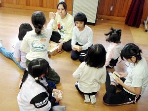 最初は通常のかるた風景で、素早くとることだけの白熱戦でしたが、2回戦目から高学年班は解説本と照らし合わせながら、読み札・絵札の中身を詳しく理解しながらのかるた大会となりました。低学年班では、一人だけの1年生が、お兄さんお姉さんの中でも多くの札を獲得していたり、2回戦目以降も多く取ることに夢中となっていました。白熱するあまり危うく紛争が起きそうな事態となるところを、教員がなだめ直す場面も見受けられ、元の仲良しに戻っていました。低学年の中でも、教員やガイド役から読み札・絵札の説明もあり、ちょっとだけ国有林の中身も知ってもらえたような気がします。かるた大会においても、児童たちの興味がつきないようで、終了時間に差し掛かってももう一回もう一回となかなか終了せず、教員からの強制終了宣言で各班ともきちんとかるたの片づけをし、校外学習全日程の終了となりました。
