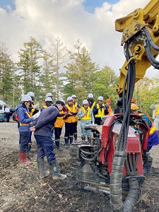 午後からは、空中消火機材の見学を行った後、高性能林業機械による造林現場を見学しました。研修生の皆さんの国では天然林が多いため、人工林とその施業に大変興味を持つとともに、施業方法や高性能林業機械などについて質問がありました。