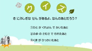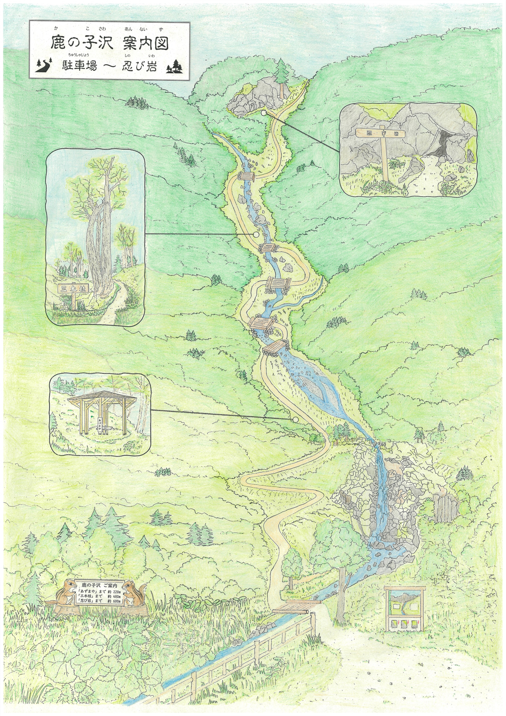 鹿の子沢風景林には、滝や巨岩、凍裂(幹の水分が寒さで凍って幹がさけた)の跡が残るトドマツ、森の巨人たち百選に選ばれたカツラ(三本桂)、湧水等があるので、森林教室の前半は、これらを絵地図と写真を使ってクイズで紹介して、森と水、森と生き物の関係を学習しながら絵地図上でゴールを目指しました。