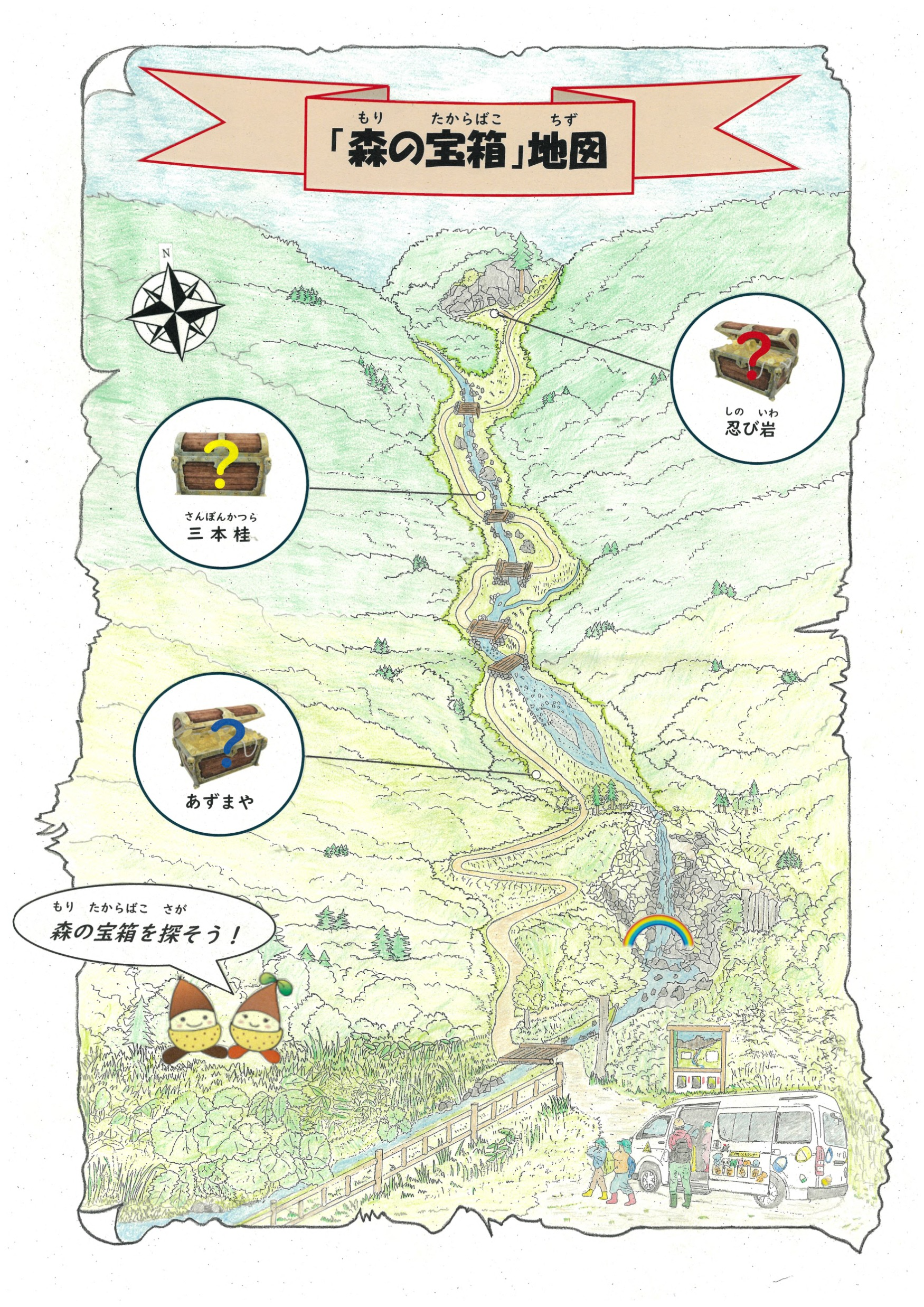 森のクイズに回答して地図上を進み、ゴールの「忍び岩」に到着、ゴールの記念として、森の宝箱をプレゼントしました。宝箱の中身は…どんぐりのネックレスや置物、葉脈標本の栞でした!(葉脈標本:葉肉を溶かして、葉脈だけ透き通って見えるように処理した葉のこと)