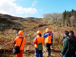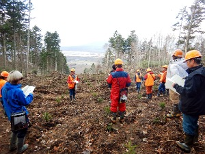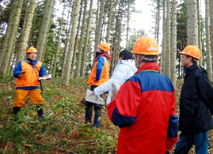 森林組合から施業方針・間伐現場の実情についての説明をいただく中で、国有林職員からも「間伐の考え方や実行の仕方に違いがあり、同じような林齢でも国有林とは異なる林相である」、「森林所有者の意向に寄り添った施業の進め方が印象的」といった国有林職員ならではの声が寄せられました。