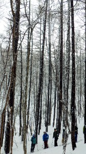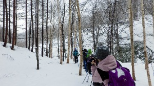スノーシュー散策では、広葉樹林と針葉樹林の両方を歩きながら、樹種の違いや、動物の顔のように見える冬芽、雪の上に残された動物の足跡などを観察しました。