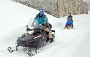 午後からは、犬ぞり用のそりをスノーモビルに取り付け、舟津さんの運転によるそりに乗車体験を行いました。子どもたちは交代しながら何度も体験し、歓声が絶えない時間となりました。当事務所の若手職員も体験しましたが、子どもたちと同じように楽しむ姿が印象的でした。