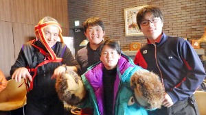 舟津さんが実際に南極で着用していた上着とビーバーの毛皮で作った手袋をつけて記念撮影(舟津さんは犬用ハーネスを着用)
