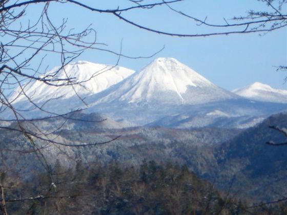白糠町(右股森林事務所部内)から撮影した阿寒富士(中央)、雌阿寒岳(左側)です。