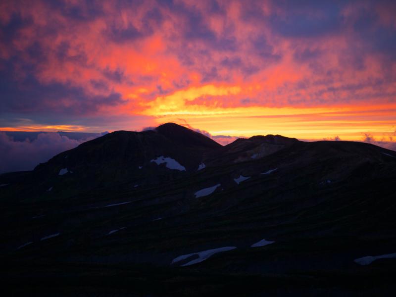 初日は雲が多く風も非常に強かったのですが、夕方には雲が抜け、夕日で旭岳方面の空が真っ赤に染まりました。白雲岳山頂より。