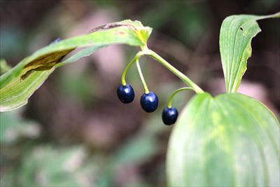 春によく見られるユリのような葉に1カ所から宝鐸のような花を1-3個ぶらさげますが、秋に黒く熟します。